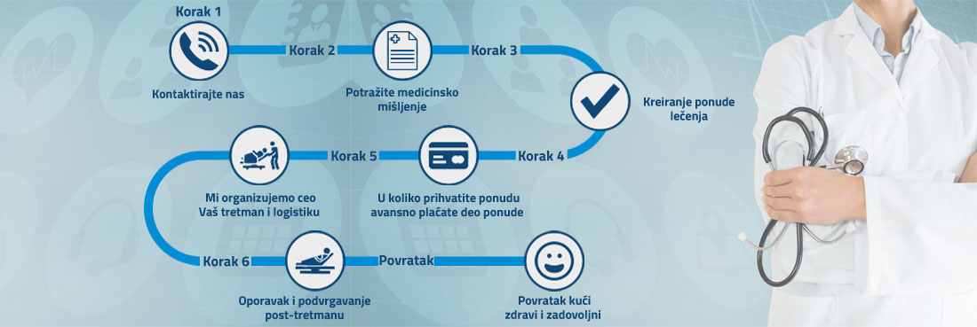 6. korak: Nakon završetka vašeg medicinskog tretmana, dobićete vaš kompletan medicinski izveštaj lečenja i sve dalje neophodne medicinske instrukcije od vašeg doktora specijaliste i dogovor oko kontrole praćenja vašeg oporavka od strane istog specijaliste.
